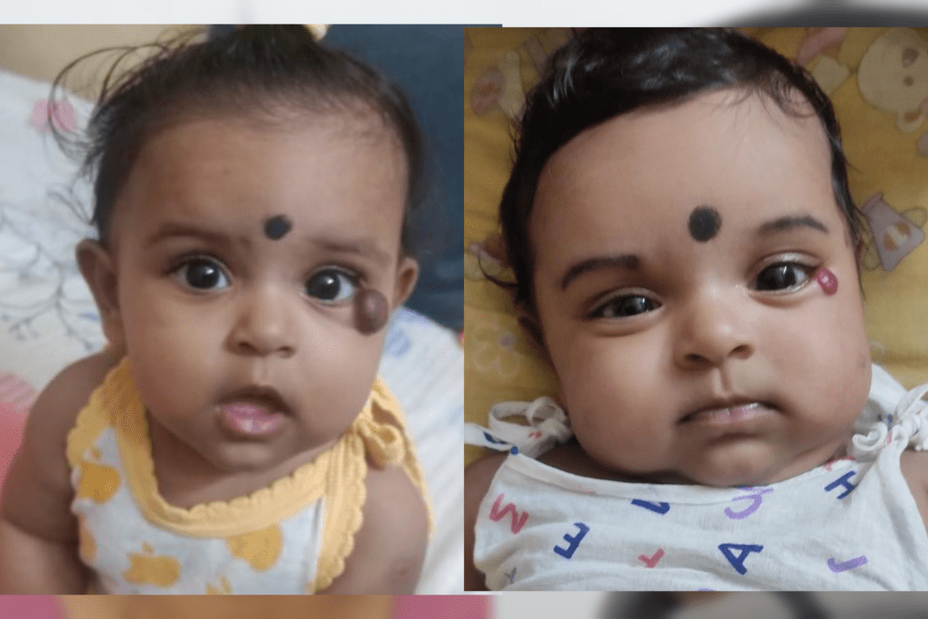 Here are pictures showing how a haemangioma developed on a baby. It appeared as a small red mole near the eyes at birth, but as the child grew over the months, it rapidly increased in size. It was only after 3.5 months that the parents decided to seek help and approached us for the best Haemangiomas treatment in Bangalore. Due to the aggressive nature of the growth, surgical excision was planned. If treated conservatively, it could have led to further facial deformity and hindered vision. Delaying surgery would have made the removal of the red mass more complex due to increased growth and tissue involvement.