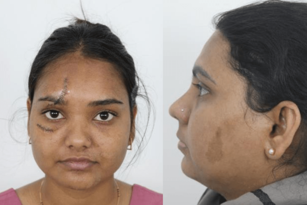 This patient had a fall injury in childhood following which she sustained scars in the right forehead and under the right eye. The scarring in the forehead caused a mismatch of the right eyebrow. Scar revision surgery was done to correct the mismatch of the eyebrow and lighten the under eye scar.
